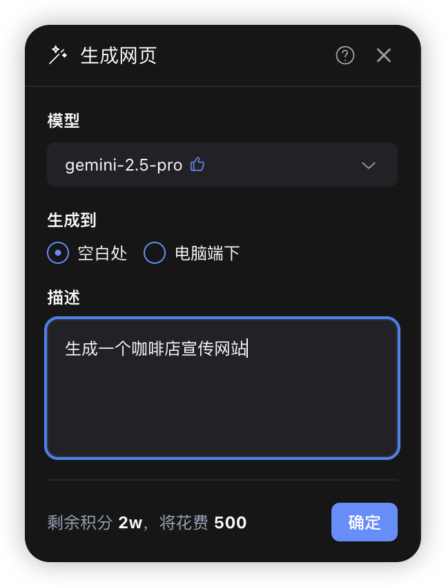 不同模型有不同的能力,一般来说都是价格越贵能力越强,比如最贵的 Claude 3.7 一次调用花费 2000 积分,生成的页面也是最丰富美观的。另外 Google 最近(2025-05-6)新出的 Gemini-2.5-Pro 在一些情况下比 Claude-3-7-Sonnet 更优秀,我们更推荐使用这个模型。
