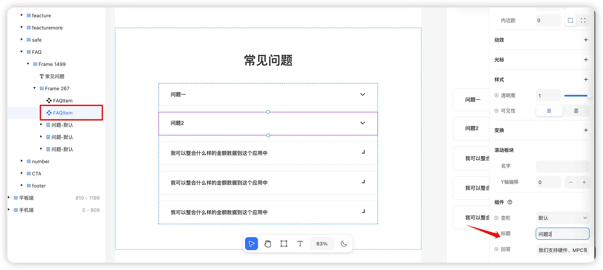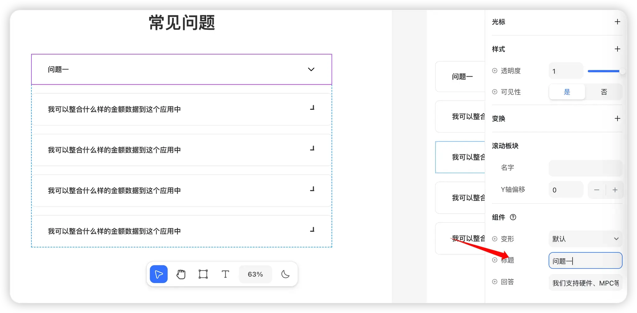 在右侧组件属性区域,可以看到 标题 和 回答 两个可配置字段